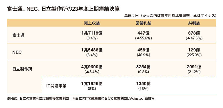 富士通は売上高にあたる売上収益が前年同期比0.4%増の1兆7118億円とほぼ前年並みを維持したが、営業利益は55.6%減の447億円、最終利益は47.5%減の378億円と大幅減益となった。前年同期にPFUのリコーへの譲渡益が生じた反動があるが、事業再編などの影響を除いた調整後営業利益も240億円減の507億円と落ち込んだ。主力のサービスソリューションは好調に推移したものの、デバイスソリューションの不振が下振れにつながった。通期業績はデバイスの回復遅れを織り込み、下方修正した。サービスソリューションの売上収益は9841億円で、PFUの事業再編影響を除くと13.6%の増収。国内を中心にDX、モダナイゼーションの強いデマンドが追い風となった。調整後営業利益に関しては444億円増の634億円で、増収効果に加えて開発標準化の進捗などで採算性が改善された点も大きいという。