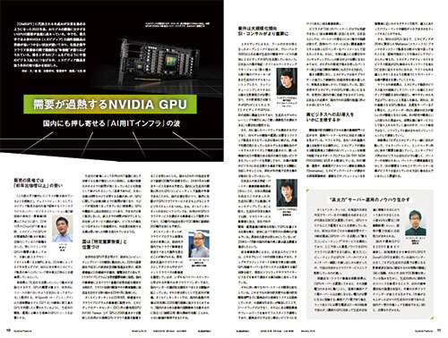 9月18・25日・1985号の「需要が過熱するNVIDIA GPU 国内にも押し寄せる『AI用ITインフラ』の波」では、AI向けGPU最大手の米NVIDIA(エヌビディア)の製品を扱う各企業が、AIブームの波をいかにビジネス拡大につなげるかを報じた。ディストリビューターのマクニカは、エヌビディアの開発環境上でAIソリューションを検証できるプログラムを提供し、販売パートナーを支援する。政府もコンピューティングリソースの確保に動き出し、経済産業省の助成を受けたさくらインターネットは、大規模GPUクラウド基盤の整備を進めた。