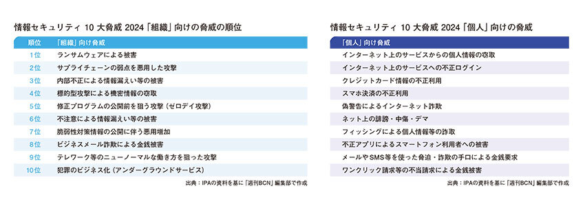 24年版組織編に選出された10大脅威は、23年版と同様の顔ぶれで、1位が「ランサムウェアによる被害」、2位が「サプライチェーンの弱点を悪用した攻撃」と、上位の並びも同じだった。IPAは「脅威の種類は同じでも、例えば、ランサムウェアは大きく報道された事件が複数あり、サプライチェーンの弱点を悪用した攻撃は本丸を狙う上での常套手段になりつつあるなど、年々危険になっている」と見解を示す。
