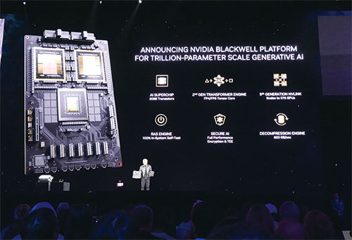 本紙4月1日号で報道した通り、GTC 2024における最大のアナウンスが、生成AIに特化した次世代GPUアーキテクチャー「Blackwell(ブラックウェル)」の発表だ。フアンCEOは「数兆パラメーターの未来に向けて設計した生成コンピューター」と表現していたが、現在世界中で争奪戦となっている現行のGPU製品「H100」に採用されている「Hopper」アーキテクチャーよりも、学習/推論で大幅なパフォーマンス向上を実現した。