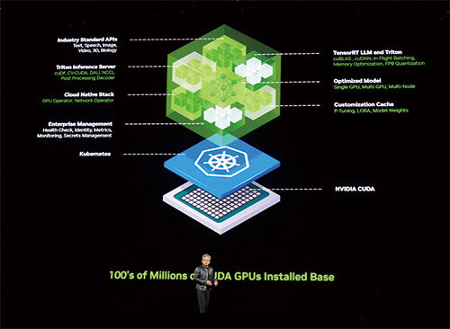フアンCEOが言う「未来に向けた生成コンピューター(generative computer)」をハードウェアとして支えるのがBlackwellなら、ソフトウェアとしてその進化を加速させ、エンタープライズでの普及を広げる存在として期待されるのが新たに発表された「NIM」だろう。NIMとは「NVIDIA Inference Microservice」の略で、文字通り推論ワークロードを最適化するために構築されたコンテナベースのマイクロサービスだ。NIMにはチューニング済みの推論エンジンや業界標準のAPI、業界・業務に特有のコード、カスタムモデルなどがまとめてコンテナ化されており、データセンター、クラウド、ローカルPCに至るまであらゆるITインフラ上にデプロイすることが可能となっている。