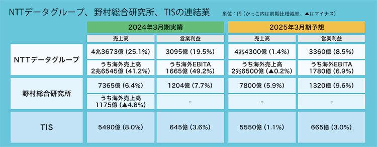 NTTデータグループでは25年度までの3カ年中期経営計画で、連結売上高4兆円超を目指すとしていたが、NTT Ltd.がフル連結となったことを受けて、25年度の目標を4兆7000億円に設定し直した。M&Aや構造改革など一時的な費用を除く連結営業利益率を足元の8.5%から10%、海外EBITAを8.6%から10%へ高める目標は据え置く。