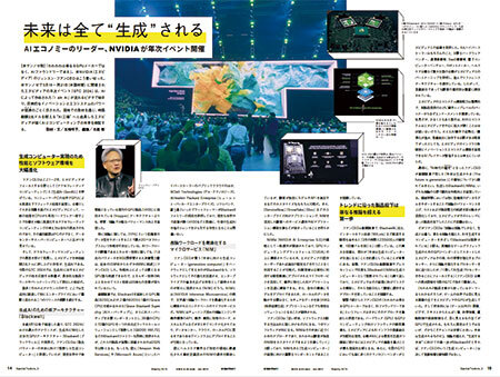 米NVIDIA(エヌビディア)の「GTC 2024」の模様 を掲載。イベントでは生成AIに特化した次世代GPUアーキテクチャー「Blackwell」を発表。現行のGPU製品「H100」に採用されている「Hopper」アーキテクチャーよりも、学習/推論で大幅なパフォーマンス向上を実現した。必要となるGPU数も削減できるため、エネルギー効率の向上と合わせてコスト効率は25倍もの改善を見込めるという。