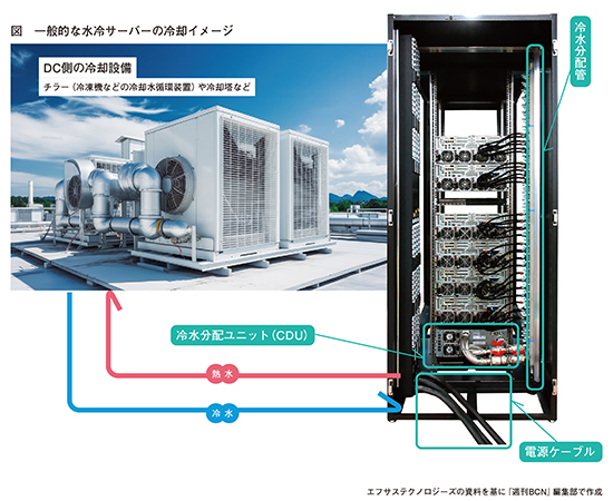 通常の空冷ではラックあたり25~30kWを冷やすのが限界とされ、サーバーラックに冷却水を引き込んで、そこに冷却用の空気を当てて冷却する間接水冷の「リアドア方式」でもラックあたり70kW程度が上限とされている。今後、GPUサーバーの消費電力がより増える見込みであることから、冷水の配管を発熱部位であるGPUに直接接触させて冷やす「直接水冷」の需要が急増すると予想されている。