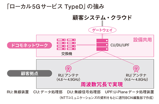 こういった課題を解決するサービスとして、NTTコムのネットワークへの接続に特化したローカル5G通信を提供する、ローカル5Gサービス TypeDを開始した。通信キャリアであるドコモのキャリアネットワークに用いられる設備を共用し、NTTコムのゲートウェイを経由して顧客のデータセンターやクラウドと接続する。これにより、コストを抑えながら設備はキャリアレベルの冗長性を担保。また、全国各地のドコモの保守要員が、TypeD向けにも24時間365日体制で保守サービスを標準提供する。