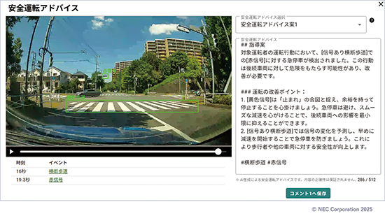 NECは10月、同社のテレマティクスサービス「くるみえ」に、生成AI技術を活用した安全運転指導機能を追加し、販売を開始した。危険につながる運転がドライブレコーダーに記録されると、映像を分析したAIが安全運転を支援するアドバイス文を自動的に生成するというものだ。