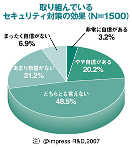 企業が取り組まなければならない課題は、情報漏えい対策だけではない。脅威は日増しに増加しており、それらに適切に対応するためには、全方位でのセキュリティ対策を施す必要がある。「インターネット白書」によると「取り組んでいるセキュリティ対策の効果」として、「非常に自信がある」「やや自信がある」を加えても23.4%にしかならず、大部分の企業は「自信がない」か「どちらとも言えない」と答えている。「どこまで対策していいのかわからない」という現状が浮き彫りになった回答と言えよう。