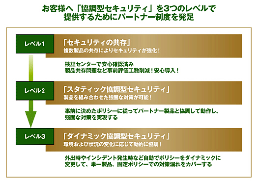 「レベル3」では、製品間のAPIなどを開示し、製品開発レベルに置いて連携を強化することで、状況に応じて複数製品の設定やポリシーなどを動的に変化させることが可能となる。トレンドマイクロの「ウイルスバスターコーポレートエディションアドバンス」との連携時には、インシデント発生時など、その時々の環境や状況に応じてポリシーをダイナミックに変更し、動的な協調を行う。顧客にとっては、管理・運用のコストを軽減でき、本来業務に集中できることになる。