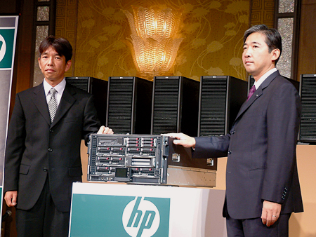 今年9月中旬、ブレードサーバを取り巻く業界に激震が走った。日本HPが“中小規模システム向け”と銘打った第3世代のブレードシステム「HP BladeSystem c3000」(以下、c3000)を発売したのだ。都内ホテルにて開催された記者発表会では、日本HP 取締役副社長執行役員 石積尚幸氏が「当社では、07年を“中小企業のIT化元年”と定めてビジネスを手がけてきました。それを一段と具現化させたのが今回の製品です」とアピールしていたほどだ。 「c3000」は、2006年6月より販売を開始した大規模システム向けの「c7000」に続くブレードシステムで、日本HPにとってサーバ事業を拡大するための戦略製品に位置づけられる。サーバブレードを最大で8台の搭載が可能なほか、エンクロージャのサイズを縦26.5cm、横48.5cm、奥行83.5cmと、かなりコンパクトに仕上げている。8台のタワー型サーバを設置する場合と比べ、63%の省スペース化を実現。ラックの設置や専用のキーボード、モニタ、マウスなどの接続が不必要で、エンクロージャへのネットワークや電源配線とシステム管理用パソコンだけでシステムを構成できる。ほかにも、これまでユーザー企業への導入で障壁になっていた電源の問題を解決し、通常の100V電源でクアッドコアCPU搭載のサーバブレードをフルに搭載できる。これは今日時点では、他社のブレードサーバで実現できていない。また、“ストレージブレード”を搭載することで、エンクロージャ内でのストレージ共有が可能なことに加え、NAS(ネットワーク・エリア・ストレージ)に対応した「HP StorageWorks All-in-One SB600cストレージブレード」でストレージの統合化にも対応可能だ。さらに、複数サーバに対してOSを同時インストールすることができるDVD-ROMドライブを搭載。今までサーバ1台につき1時間以上(計8時間以上)かかっていた作業を2時間30分程度と大幅に短縮した。