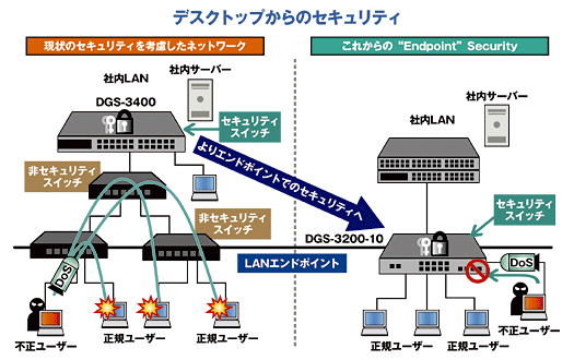 ディーリンクジャパンは、11インチ幅のコンパクトなファンレス筐体でオールギガビットポートを搭載したエッジスイッチ「DGS-3200-10」を提供している。これは、ディーリンクジャパンが企画、製品化した商品で、世界に先駆けて国内市場で提供されている。NOSiDE LAN検疫やMicrosoft NAP検疫、ROUD/RegistGateハードウェア認証など、さまざまなPC検疫・ユーザー認証方式に対応し、「INTEROP 2007」の「Best of Show Award」インフラ構築製品(Edge)分野でグランプリを獲得した。また、標準価格を4万9800円に抑え、デスクトップからのセキュリティを具現化し、社内LANのエンドポイント・セキュリティを大幅に強化する製品として訴求している。「PC検疫や認証を行うには、これまで最低でも30万円程度のセキュリティスイッチを導入しなければなりませんでした。導入コストの問題から、そのようなセキュリティスイッチをいわゆる“島ハブ”として導入することは困難で、非セキュリティスイッチの活用が余儀なくされていました」と、マーケティング本部・プロダクトプランニングの澤太一マネージャーは語る。■製品間連携で付加価値を訴求