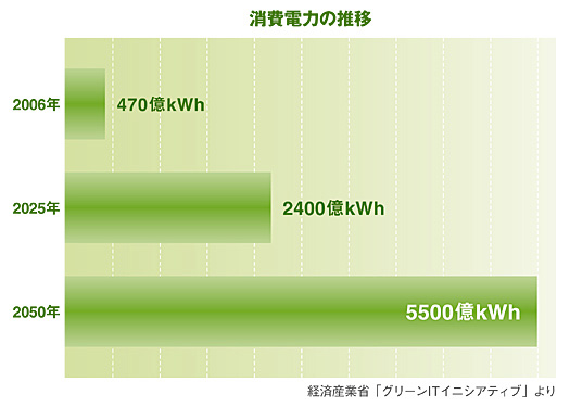 環境負荷の低減が求められるなか、大きく注目されているのが情報通信技術分野である。現在、生産・流通・消費といった経済活動や行政の効率化を飛躍的に進展させている情報通信技術。これらの情報通信機器は、今後、さらに増加・高機能化することは想像に難くない。しかし、それに伴い、これらの機器が消費する電力も増大する。つまり、環境負荷の増大が危惧されているのである。経済産業省の試算によれば、社会で扱う情報量は、25年にはおよそ200倍、消費電力はおよそ5倍、2400億kWhになると予想している。