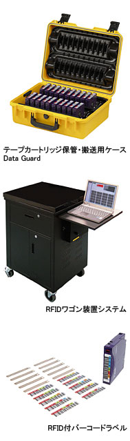 イメーションでは、RFIDの読み取りアンテナや管理用端末など、RFIDによるテープの管理・運用に必要な装置一式を搭載した「RFIDワゴン装置システム」や、RFID付きのバーコードラベルを貼り付けるサービスを提供している。テープの搬送に使われている金属ケースだが、テープの周辺はクッション材で囲われ、テープの出し入れでチリ・ゴミが発生し、テープの記録面に付着してエラーが起きることが懸念されている。それらの声に応えるべく、テープカートリッジの保管・搬送用ケース「Data Guard」を開発・提供している。
