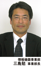 「当社は従来から、SOHO(スモールオフィス、ホームオフィス)を念頭に置いた商品展開を図ってきましたが、ジャスティオも当然この市場をターゲットに開発しています。小規模ビジネス空間で働く人々にとって、コンパクトさは極めて重要で、用紙の管理面などからも複合機、とくにファクス機能を搭載した複合機のニーズは高いと判断しています。出足は予想していたより好調で、とくに最上位の複合機が伸びています」と、情報機器事業部の三島勉事業部長は説明する。