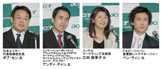 発表会では、アンディ・チャン氏に先駆け、日本エイサーのボブ・セン社長が登壇し、歴史と近況を語った。「エイサーは、2000年、ブランドPCにコアビジネスを転換し、以降、インダイレクトビジネス、マルチブランドによって急成長を遂げています。世界市場ではシェア第3位、ノートPCでは世界シェア2位となり、売上高、利益、出荷数とも順調に推移しており、欧米、そしてエマージングマーケットで着実にエイサーブランドは浸透しています」。