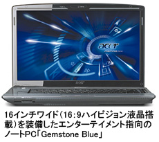 「Gemstone Blueは、ノートPC『Aspire』シリーズの高級製品ブランドの第2世代です。従来の16:10ではなく、ハイビジョンテレビと同じ16:9比率の液晶ディスプレイを搭載し、TVやDVD/BDなどのワイドコンテンツを黒い余白なく楽しむことができます」。