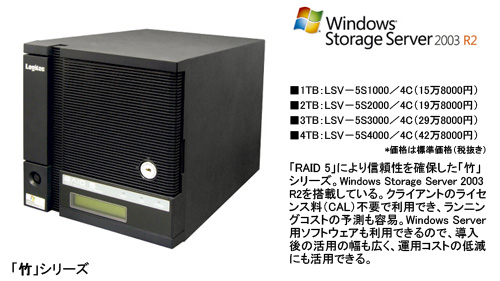 ロジテックでは、6月にWindows Storage Serverを採用したNASシステム「竹(LSV-5Sシリーズ)」をリリース。「製品名の“竹”ですが、“松竹梅”の“竹”です。開発コードとしてつけていたのが、そのまま製品名になってしまいました」(中田氏)とのことだ。