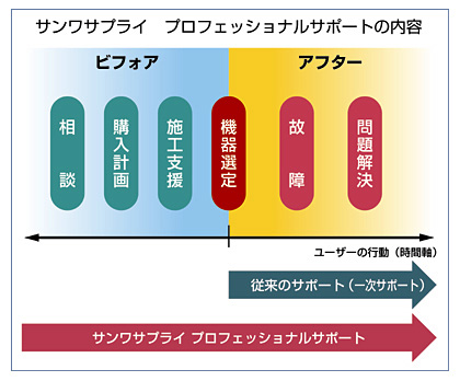 若尾社長は、「従来のサポートは、製品の性能、使用方法、修理の判定など言ってみれば購入後のアフターサポートでした。しかし、そこから時間軸を遡っていくと、問題解決から商品選定、さらにその先のネットワーク構築の計画、相談へと移っていきます。つまり、『アフターからビフォアへ』、私たちが目指すサポートはそこにあります」と、一歩先行くプロフェッショナルサポートの方向性を語る。