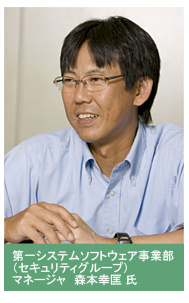 「これまでのWebフィルタリングは、サーバの構成やSI費用などが必須で、200-300万円ほどかかるソリューションでした。この費用が中堅-中小企業がWebフィルタリングを導入する上で足かせになっているのです。そこで、中堅-中小企業向けに低価格のWebフィルタリングアプライアンスを企画しました」と、第一システムソフトウェア事業部(セキュリティグループ)マネージャの森本幸匡氏は語る。