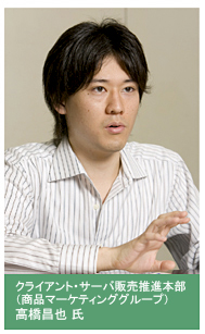 これが、中小企業など専任のIT管理者がいないところに導入が進んでいる理由の1つです。 また、アプライアンスで提供しているため、販売面においても提案しやすいソリューションになっています」と、クライアント・サーバ販売推進本部(商品マーケティンググループ)の高橋昌也氏は語る。