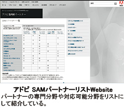 また、パートナーが、顧客に、コンサルティングやインベントリーサービスなどをより効果的に行えるようなSAM関連ツールや部材などの提供を行う予定だ。(画面:アドビ SAMパートナーリストWebsite参照)