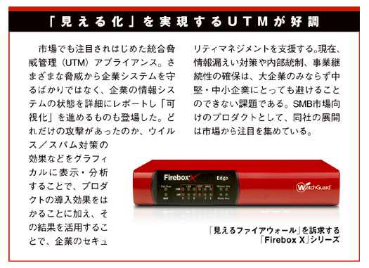 UTMは、ファイアウォールをベースに、アンチウイルス、不正侵入防御、Webフィルタリングといった複数のセキュリティ機能を統合的に管理するソリューション。アプライアンスとして提供されることが多く、設置することで高レベルのセキュリティ環境を構築できる。また、それぞれのプロダクトを個別に導入する場合に比べ、コスト面でも有利だ。さらに、それぞれのセキュリティ機能を一元的に管理できるため、運用しやすいというメリットもある。最近では、セキュリティレポート機能を充実させたプロダクトも提供されており、企業のネットワークを「可視化」するものもある。
