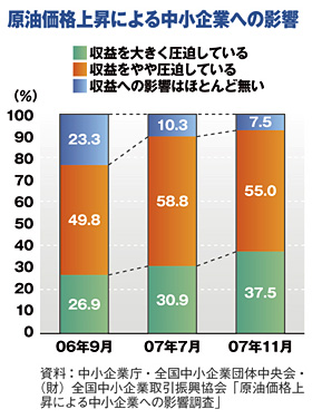 また「原油価格高騰」は、ガソリン価格の値上げにとどまらず、窯業・土石製品、石油製品、パルプ・紙製品、出版・印刷、クリーニング、運輸、繊維工業など、幅広い業種に影響を及ぼした。中小企業庁・全国中小企業団体中央会・財団法人 全国中小企業取引振興協会などの「原油価格上昇による中小企業への影響調査」によると、06年9月には、(1)収益を大きく圧迫している=26.9%、(2)収益をやや圧迫している=49.8%、(3)収益への影響はほとんど無い=23.3%だった。07年11月には、(1)収益を大きく圧迫している=37.5%、(2)収益をやや圧迫している=55.0%、(3)収益への影響はほとんど無い=7.5%となっており、9割を超える企業の収益を圧迫していることが明らかになった。原油価格高騰によるコスト上昇分を自社の製品・サービス価格に転嫁することが困難な企業も多く、利幅が悪化している現状が浮き彫りになっている。