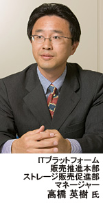 「これまでハイエンドからミッドレンジのSANストレージを中核に販売してきましたが、ここ数年、中堅・中小企業システムにおいてもデータ量が増加し続けており、信頼性・拡張性が高いストレージへのニーズが高まっています。価格を抑えたSANが欲しいというお客様の声に応え、08年1月に最小構成で89万8000円という値付けの“iStorage E1”を発売しました」と、ITプラットフォーム販売推進本部・ストレージ販売促進部・マネージャーの高橋英樹氏は語る。