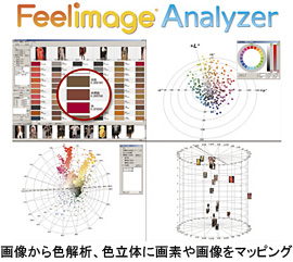 デジタル画像色解析システム「Feelimage Analyzer」は、色および画像を解析し、画像に含まれている色名や主要色の抽出、 色立体における色名の分布、画素の分布、画像のマッピングなどを実現できる。