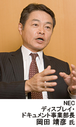 「北米や欧州ではデジタルサイネージが進んでいます。“デジタルサイネージ”という言葉も一般用語となり、新聞でも見出しに使われるまでになっていますね。用途も多岐にわたっており、市場としても二桁成長を続けています」と、NEC・ディスプレイ・ドキュメント事業部長の岡田靖彦氏は語る。