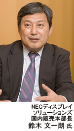 「デジタルサイネージは、広告の一手段として捉えられることが多いと思います。確かにそういう側面もありますが、企業内での情報共有や情報発信にも使えます。映像は人の感性を刺激します。その表示ツールとして、ディスプレイやプロジェクターなどのハードウェアを揃えています」と、NECディスプレイソリューションズ・国内販売本部長の鈴木文一朗氏は語る。