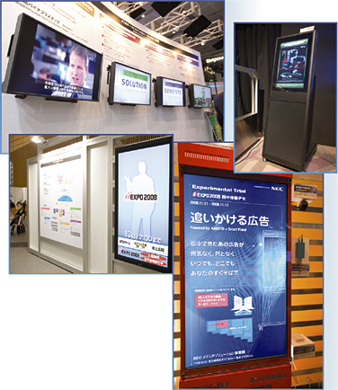 | ビジネスチャンスを創出する デジタルサイネージの世界 2008年11月に東京国際フォーラム(東京)で開催された「iEXPO2008」の会場では、いたる所でデジタルサイネージが活用されていた。まず会場入り口では65インチのパブリックディスプレイが掲げられ「iEXPO2008」の見所を紹介。裏側にあるPCから出力されたものだが、表示コンテンツを簡単に作成できるツール「ADWINDOW」もNECでは提供している。静止画・動画・テロップなどを組み合わせ、効果的な表示を実現している。 NECのパブリックディスプレイは、高効率・長寿命のバックライトを採用しており、表示面からの熱輻射を抑え、輝度ムラのない均一画像を再現。複数ディスプレイの集中管理も容易で、1台のホストコンピュータから操作できる。また、15.5mmのスリムベゼルを採用し、マルチスクリーンを構成した際の映像の欠けを最小限にするといったモデルも投入されている。赤外線やエリアワンセグ放送、FeliCaリーダライタ搭載のデジタルサイネージを使って、映画のチケットや予告編、上映情報などを携帯電話向けに発信するシステムも提供されていた。 NECは、POSシステムや情報配信のシステムなど数多くのソリューションを有している。それらを組み合わせたトータルデジタルシネマソリューションなども非常に好評だった。また、パソコンを使用しないデジタルサイネージも実施されていた。メディアプレーヤー「MP-01」をモニタ背面に搭載することで、スペースを気にせず情報表示することができる。さらにスタンドとモニタを組み合わせ、導入を容易にしたスタンド一体型デジタルサイネージキットも、効果的に配置されていた。デジタルサイネージは、広告という枠組みだけではなく、幅広い用途に活用され始めている。ソフトウェア/ハードウェア/コンテンツを有するNECの強みが存分に生かされた提案と言えよう。  |