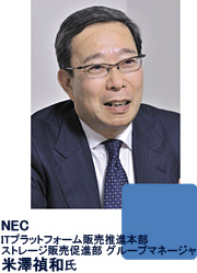 米澤(NEC) サーバーを含めた提案として「仮想化」がキーワードになってきます。SMBでは、部分的な仮想化や統合化も必要になっています。ですので、サーバー統合化に合わせ、ストレージ統合化の提案も必要になってくるでしょう。