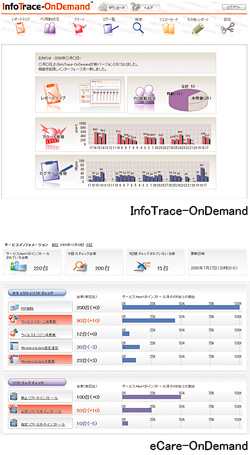 「eCare-OnDemand」は、OSのセキュリティパッチやアンチウイルスの更新状況の管理のほか、P2Pソフトウェアの起動を監視して自動的に削除するなど、手間のかからないPCセキュリティ対策だ。「InfoTrace-OnDemand」は、PC利用ログの収集から分析、レポート、管理、運用まですべてを提供するログ分析ツール。さまざまな情報漏えい経路を監視し、的確に利用状況を把握できる。