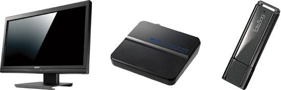 (左から)マルチタッチ機能対応フルHD液晶ディスプレイ「LCD-AD221FB-T」、Windows Media Center対応デジタル3波TVキャプチャ「GV-MC7/VZ」、BitLocker To Go /ReadyBoost対応USBメモリー「TB-7Tシリーズ」