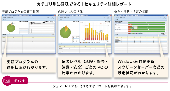 セキュリティ対策状況の詳細把握でも分かりやすさを追求した。現在のセキュリティ状況をひと目で把握できる「セキュリティ診断レポート」では、必要な項目を集計・グラフ化。付加情報を加えなくても、そのまま報告書として活用することも可能だ。