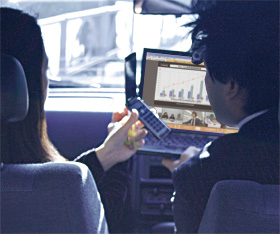 外線連携機能(オプション)で外出先の社員も 車を駐車し携帯電話で会議へ参加 |
