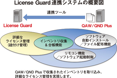 「QAW/QND Plus」でIT資産管理市場をけん引するクオリティは、有力ITベンダーとのコラボレーションで、“他にはない”のSAM(ソフトウェア資産管理)ソリューションを展開している。大手SIerの日立情報システムズ(日立情報)と協業。同社のライセンス管理システムで多数の導入実績がある「License Guard」と、「QAW/QND Plus」を連携させ、他社にはないソリューションを共同開発。SAM分野でも存在感を示している。ソフトウェアのライセンスを適切に管理するためには、従業員・職員のPCにインストールされているソフトのライセンス数と、購入数を照らし合わせる必要がある。企業・団体に点在する大量のPCに、インストールされている膨大なライセンスを管理するのは相当の手間。ライセンス証書を一元管理していないケースも珍しくなく、ツールを活用しなければ、事実上ライセンスの管理はできないのが実情だ。