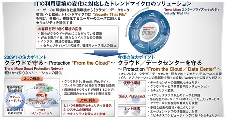 複雑化、多様化する顧客のIT環境のセキュリティニーズに応えるため、トレンドマイクロでは三つのソリューションを戦略的製品と位置付け、市場の拡大を進めている。クラウド、物理マシン、仮想化の混在環境に対して均一のセキュリティポリシーを適用するソリューション「Trend Micro Deep Security」は、仮想化技術の普及が進む北米を中心に大手企業のミッションクリティカルシステムおよびデータセンターでの大規模利用の多数実績をもち、今年3月に日本でも満を持して出荷開始となった。また、企業内ネットワークでプログラムの振舞いを監視し、潜在的なマルウェアを検出するサービス「Trend Micro Threat Management Solution」は、中国やアジアに進出している日系企業を中心に販売実績を伸ばしている。このほか、企業内システムからの機密情報漏えいを防止する「Trend Micro Data Loss Prevention」はヨーロッパやアジア圏での実績もさることながら、国内でも成長している製品だ。