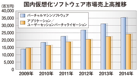 また、仮想化関連ソフトも中長期的な成長が見込める。システムやアプリケーションを仮想システムで動作させるための仮想化ソフトだ。IDC Japanによると、09年の仮想化ソフト市場規模は287億400万円で、前年に比べて11.8%伸びた。09年~14年のCAGRは15.7%で、14年には595億円に拡大するとみている。