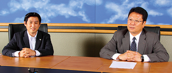 協業したプリンストンテクノロジーの中出敏弥社長(右)とキクデンインターナショナルの菊池文武社長