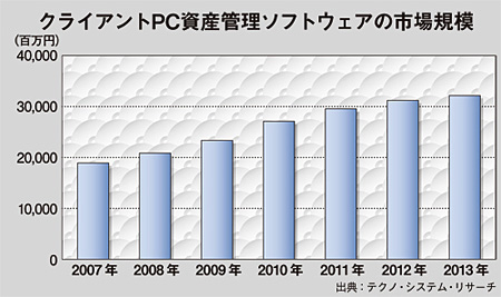 半面、煩雑化するソフト資産管理に関連するビジネスは、不景気で求められているコスト削減と相まって、ITを販売するベンダーにとって商機となる。正規に購入したライセンスの総数を把握し、パソコンにインストールされているソフト総数を確認。そのうえで、インストールされているソフト数が購入ライセンス数を超えていないかを見定める――。簡単にいえば、これがソフトライセンスを的確に把握・管理するための術だ。ただ、膨大なPCに大量のソフトが導入されている現実を考えれば、ITツールなしでは実現は難しい。ソフトライセンス管理機能をもつIT資産管理ツールの出番だ。IT調査会社のテクノ・システム・リサーチは09年8月、国内PC(IT)資産管理ソフト市場(ライセンス、関連サービス)を調査している。その調査結果から、2007年から2013年の年間平均成長率を9.2%と試算。2013年の市場規模は、321億円に達するとみた。メジャーなソフトカテゴリに比べて、市場規模は小さいものの、2013年までのIT産業全体の年間平均成長率はマイナス(IDC Japanによる分析)だけに、有望分野であることは間違いない。
