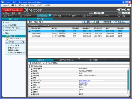 「Hitachi IT Operations Director」は、自動で収集したライセンスの各情報に加え、契約種別、契約開始日と終了日、契約状態、支払い方法などの契約情報を関連付けて一元管理できる。スキャンした契約書のデータを、ライセンス情報の欄に添付して保存・管理することも可能だ。契約期限が迫っているライセンスだけを抽出して一覧表示する機能も備えているので、契約更新や終了作業が発生する時期を事前に把握することもできる。これらの機能により、柔軟で正確なライセンス管理を簡単に行えるのだ。