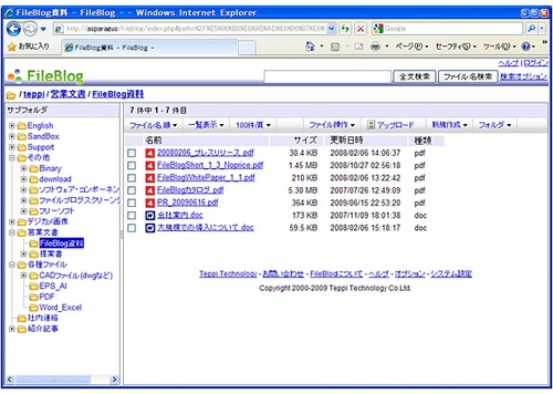 「FileBlog」は、Windowsファイルサーバーに組み込んで利用するウェブアプリケーションソフトで、「情報共有の活性化」と「データ検索の効率化」をサポートする有力機能を備える。ファイルサーバーに格納するデータへのアクセスを、社内のLAN経由だけでなく、インターネットを通じても可能にしながら、格納している膨大なデータから欲しい情報をすばやく探し出せる。それが「FileBlog」のメリットだ。