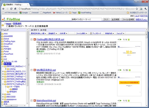 データ検索機能も分かりやすい。一般的に、検索は検索窓に情報を入力するだけでは欲しい情報にたどりつきにくく、「and検索」で条件を絞り込んでも、検索元のデータ量が多ければ多いほど、探しにくくなるものだ。「FileBlog」はこの点を考慮して、ユーザーが検索単語を入力する方法に加え、「フォルダ階層検索」という検索方法を備えた。画面にファイルサーバー内のフォルダを一覧表示し、欲しい情報がありそうなフォルダをクリックし、その後に検索単語を入力することができる。シンプルな機能だが、「作業は大幅に減る」(岡田社長)という。