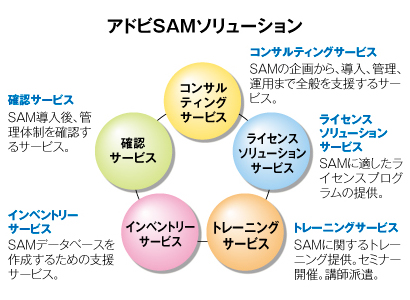 アドビ システムズは2008年3月、企業や官公庁・自治体などの組織を対象にして、SAMの支援活動を展開するパートナー向けの「SAMパートナープログラム」を開始した。現在は同プログラムに18社が加盟している。同プログラムの開始から2年半の間、中長期的に組織がSAM体制を構築するための方策を支援するためのトレーニングやSAM成熟度レベル評価制度、SAMを支援・サポートするために最適な提案活動となる「SAMソリューション」を提供してきた。また、09年10月には、「エンドユーザー側でのSAM実施に適しており、SAMの観点からもパートナーの販売機会を増やす」(宮澤啓一郎・ライセンスコンプライアンス管理部 シニアマネージャー)ことを目的に新ボリュームライセンスプログラム「Adobe Volume Liscensing Progran(AVL)」を開始している。