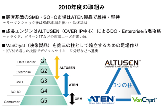 そのATENジャパンが、今年度から進めている施策の一つが、アプローチするマーケットの拡大である。マーケットを顧客の規模ごとに5つに区分し、それぞれに合わせた販売形態とブランドを用意した。具体的に言えば、コンシューマ向け製品はOEMビジネスで自社ブランドの開発・販売は手がけず、SOHOとSMB向けでは「ATENブランド」で製品をシリーズ化。大企業とDC事業者向けには「ALTUSEN」というブランドで攻めることを基本戦略に据えた。
