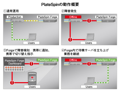 運用も極めて簡単だ。バックアップは、設定に応じて全自動で行われる。煩雑な作業はなく、物理・仮想を問わず、システムを丸ごとバックアップする。万一障害が発生した場合は、「PlateSpin Forge」が情報システム管理者に通知し、障害発生中は待機サーバー(バックアップしているサーバー)に切り替わるので、ユーザーは障害が発生している間もシステムを止めることなく、業務を継続できる。障害が発生したサーバーに代わってサーバーを入れる場合は、違うメーカー製品でも対応でき、復旧作業の手間も大幅に軽減できる。