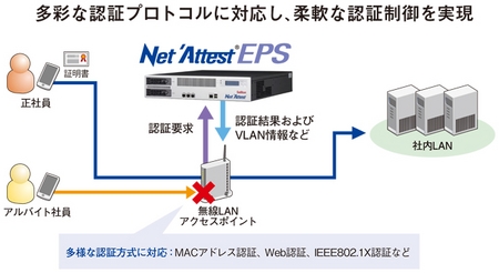 スマートフォンのセキュリティ製品の利便性を保ちながら、効果的にセキュリティ対策を講じられるのが、ソリトンシステムズのネットワーク認証アプライアンス「Net'Attest EPS」だ。デバイスを問わず、社内のネットワークに対して正規のユーザー(端末)にアクセスを許可し、不明のユーザーを拒否する。発想はシンプルだが、その実現のためにはさまざまな技術が必要で、それを「Net'Attest EPS」は漏れなく実装している。