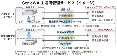 UTMを導入すると、項目の設定が必要な場合がある。しかし、UTMの設定変更は専門知識がないユーザーには負担で、変更のたびにSIerへ依頼すれば別途コストがかかってしまう。この課題を解決するため、キヤノンITソリューションズは、ユーザー企業に代わって同社がSonicWALLの設定内容をリモートで変更する「設定情報変更サービス」を提供している。
