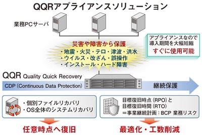 肥田部長は、「東日本大震災を受け、企業は『事業継続』や『災害対策』に本気で取り組まざるを得なくなっています」と直近の感触を語る。そして、このキーワードにピタリと適合するのが、クオリティソフトが提供する「QQR(Quality Quick Recovery)」。アプライアンス型リアルタイムバックアップ/リストアソリューションだ。直近のデータを短時間で復旧できるほか、バックアップの運用負荷を大きく軽減する。取得するデータは、変更ブロックだけ。ネットワークへの負荷が軽いので、遠隔地からのバックアップにも十分対応できる。また、災害そのものによる停電、計画停電などにより、データが消失してしまった場合でも、直近状態に戻すことができる。これまでのバックアップの課題を解決するソリューションとして、いま注目を集めている。